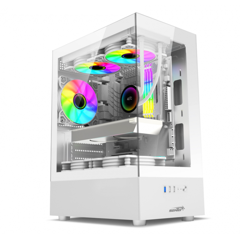 El gabinete gamer SENTEY H10 posee una ventana transparente en su frente y otra lateral posibilitando la visualización de todos los periféricos gamer con luz LED que le sumes al equipo y otorgándole una estética superior.